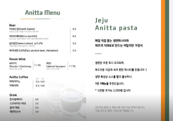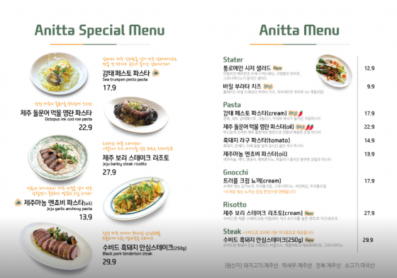 대파백명란파스타, 흑돼지안심스테이크, 감태페스토파스타, 돌문어먹물명란파스타, 흑돼지라구파스타, 풍기리조또&비프스테이크, 제주마농꽃멸치파스타, 트러플크림뇨끼