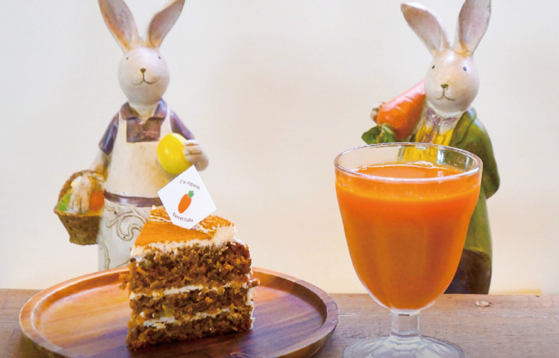 일체의 첨가물이 들어가지 않은 당근 그대로인 주스인데 건강한 단맛이 나서 맛있어요. 별로 달지 않고 포슬포슬한 당근케이크도 식감도 좋고 최고네요.