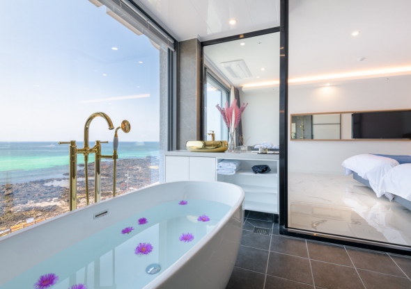 뷰가 미쳤어요..근데 밑에층 가면 바다는 잘 안보일거같아서 3층 이상으로 묵는게 좋을거같아요 복층을 한층으로 개조한건지 층고가 어엄청 높아서 너무 좋구요 침대 넓고 티비 크고 욕조 너무 좋아요. 욕조는 10시까지 사용할수 있고, 크고 따뜻한 물 잘 나와요. 밤엔 밖에서 다 보여서 블라인드 꼭 치고 있어야해요. 화장실에 욕실용품 다 있어서 편했어요 다만 바닥 단차 때문에 여러 번 넘어질 뻔 해서 그건 조심해야할거같아요! 밑에 편의점 있어서 좋고, 일출 넘 잘보입니다.버스가 잘 안와서 시간 촉박하게 역으로 가야 하는 사람들은 택시 타야해요! 가격도 그렇고 너무 만족스러웠어요.