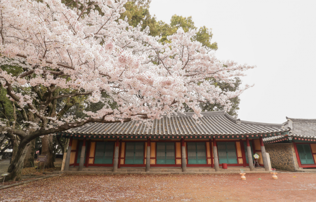삼성혈의 고즈넉한 한옥과 담백한 전각들은 제주 신화의 현장을 오롯이 느끼게 해주는 공간입니다. 벚꽃이 만개했을 때 방문하면 환상적인 풍경을 만날 수 있다고 알려져 있지만, 벚꽃이 진 이후에도 삼성혈의 봄은 충분히 아름답습니다