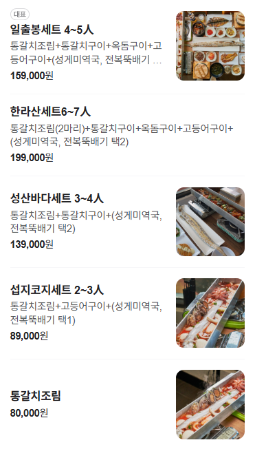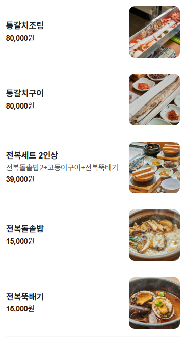 통갈치조림, 통갈치구이, 전복돌솥밥, 전복뚝배기, 다양한세트메뉴