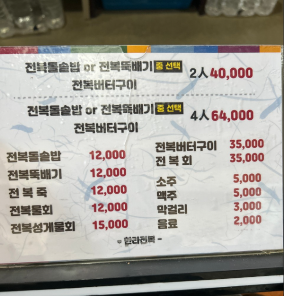 전복돌솥밥, 전복뚝배기, 전복죽, 전복물회, 전복성게물회, 전복버터구이, 전복회