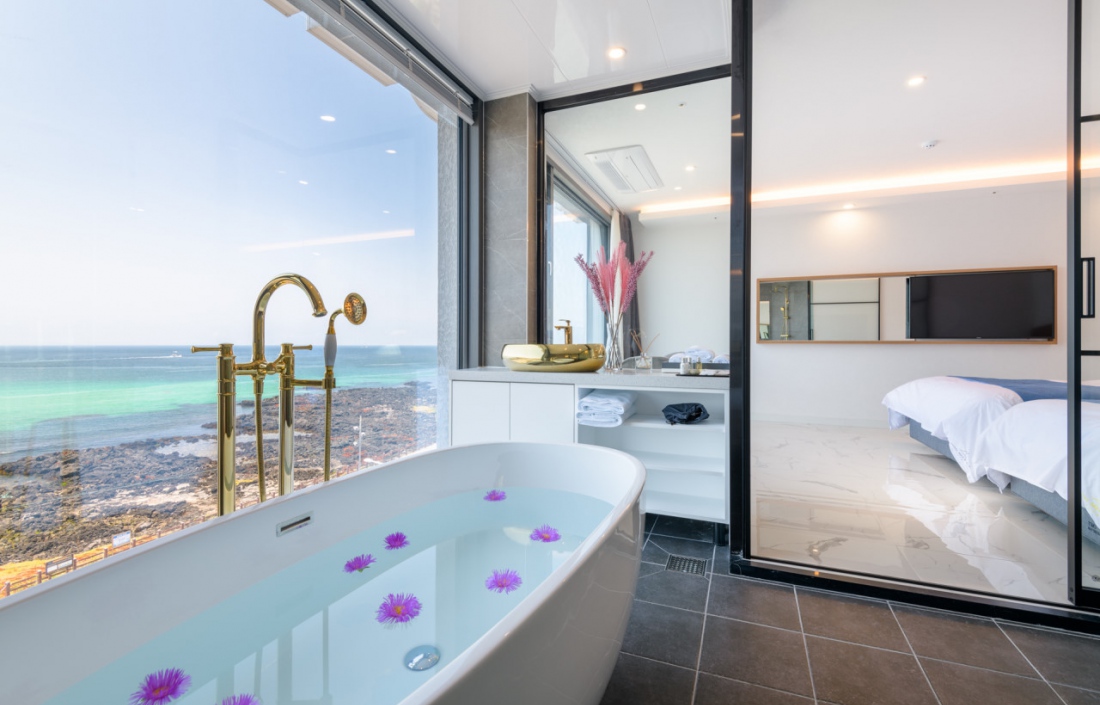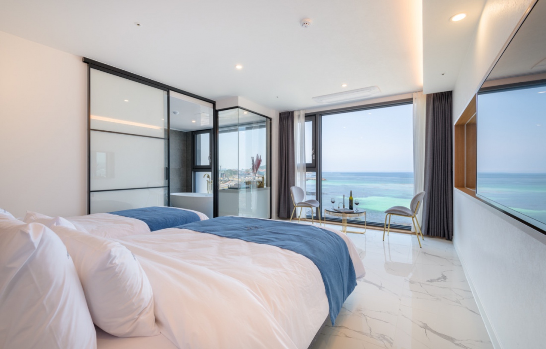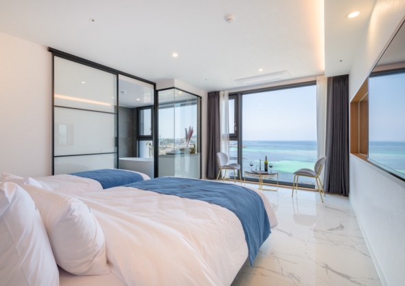 뷰가 미쳤어요..근데 밑에층 가면 바다는 잘 안보일거같아서 3층 이상으로 묵는게 좋을거같아요 복층을 한층으로 개조한건지 층고가 어엄청 높아서 너무 좋구요 침대 넓고 티비 크고 욕조 너무 좋아요. 욕조는 10시까지 사용할수 있고, 크고 따뜻한 물 잘 나와요. 밤엔 밖에서 다 보여서 블라인드 꼭 치고 있어야해요. 화장실에 욕실용품 다 있어서 편했어요 다만 바닥 단차 때문에 여러 번 넘어질 뻔 해서 그건 조심해야할거같아요! 밑에 편의점 있어서 좋고, 일출 넘 잘보입니다.버스가 잘 안와서 시간 촉박하게 역으로 가야 하는 사람들은 택시 타야해요! 가격도 그렇고 너무 만족스러웠어요.