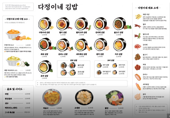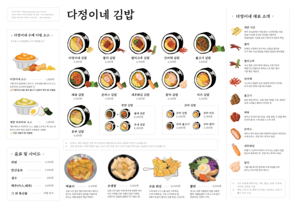 주요메뉴 다정이네김밥, 멸치고추김밥, 수제디핑소스(계란타르타르), 수제디핑소스(다정이네소스), 옛날떡볶이