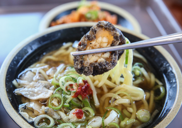해물라면 신선한 해물이 듬뿍 들어가서 해물 맛 완전 진해요 ㅠㅠ 다른 데서는 먹기 힘든 고소하고 진한 풍미의 전복김밥도 먹을 수 있어서 좋아요