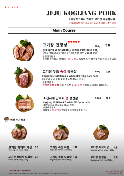 주요메뉴 고기장 진정성(목살/오겹살/항정살/가브리살 70set), 고기장 두툼 숙성 통목살, 조선시대 난로회 생삼겹살